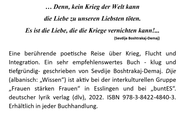 Wir fragen auch, ob die Welt bei der spontanen Schweige-und Lichterdemonstration auf der Agnesbrücke in Esslingen und dem Einstehen für Werte wie Freiheit, Demokratie, Toleranz, Respekt, für ein gut nachbarschaftliches Miteinander und für eine in unserer Stadt gelebte Willkommenskultur seit den Attentaten in Paris für unsere buntES - Mitglieder „gefährlicher“ geworden ist ?