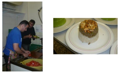Nach einer freundlichen Begrüßung in Englisch und Deutsch vom Gastgeber wurden Essen und Getränke serviert. Ein besonderer Abend bedeutet auch ein besonderes Essen. Einige Flüchtlinge bereiteten ein köstliches Gericht unter der Regie eines Chefkochs vor. Reis mit Fleisch und gebratenen Cashewnüssen war das Highlight des Abends. Ein himmlisches Stern-Essen vom Chefkoch und seinem Team! Leider musste der Chefkoch die Stelle in einem Sterne-Hotel in seinem Heimatland wegen des Krieges aufgeben und fliehen.