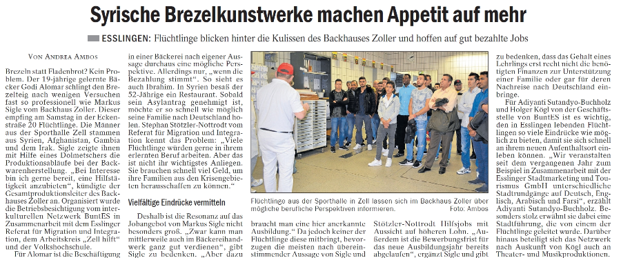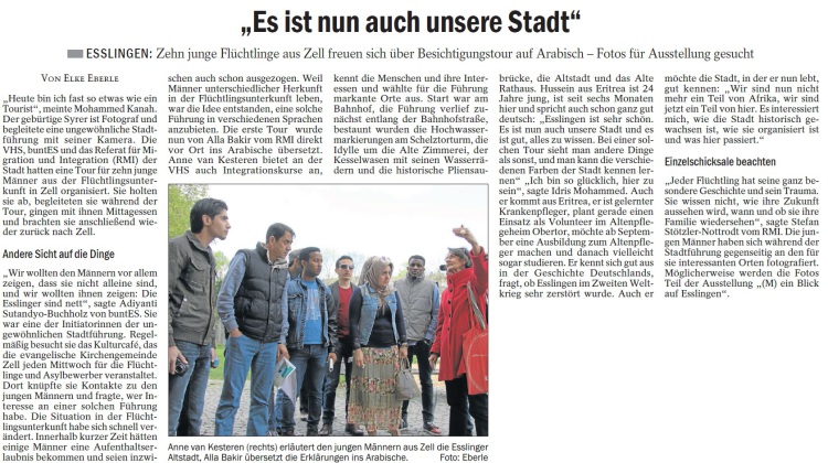 buntES engagiert sich für die „Willkommenskultur der Stadt“: Am Samstag, 18. April 2015 fand eine erste Deutsch-Arabische Stadtführung mit "Männern von der Sporthalle-Zell" statt. Die Stadtführung war eine gemeinsame Veranstaltung zwischen buntES, dem Fachbereich Kultur der Volkshochschule Esslingen (vhs) und der Stadt Esslingen am Neckar - Referat für Migration und Integration (RMI).
